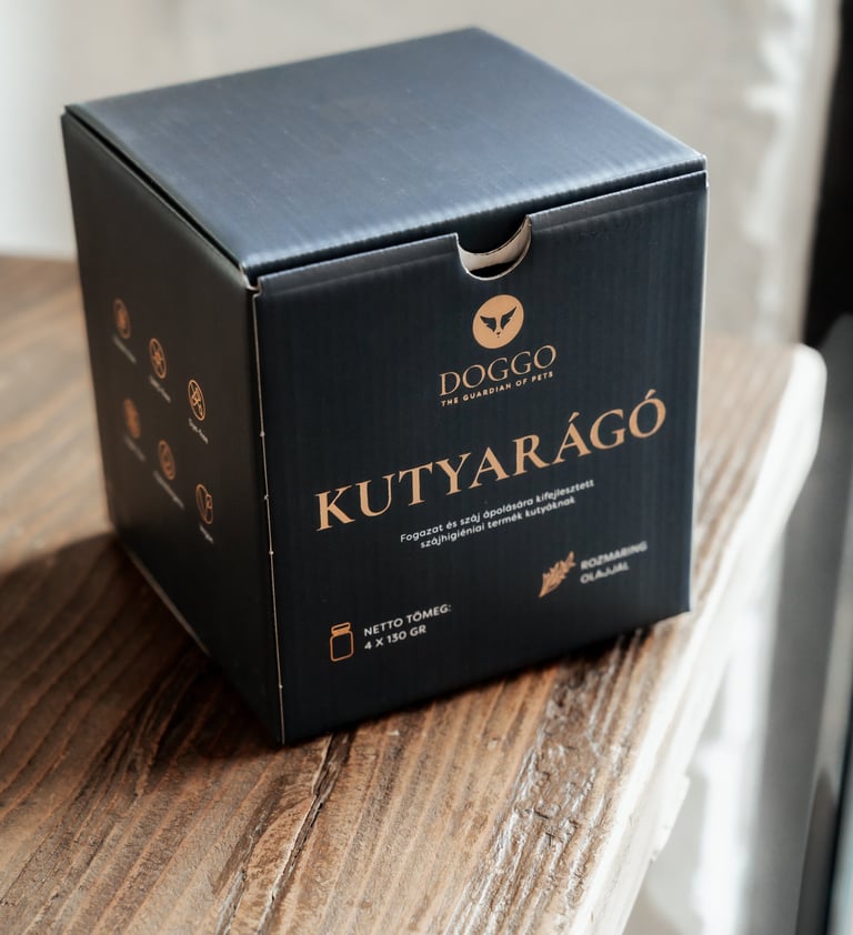 A díszdoboz 4 x 130 gramm Kutyarágót tartalmaz tégelyes kiszerelésben.